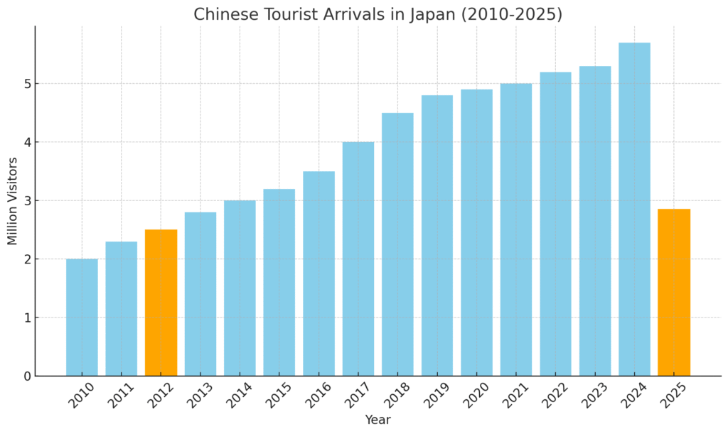 - Orange bars highlight key years: 2012 (Senkaku dispute) and 2025 (current year, projected drop if travel ban persists).