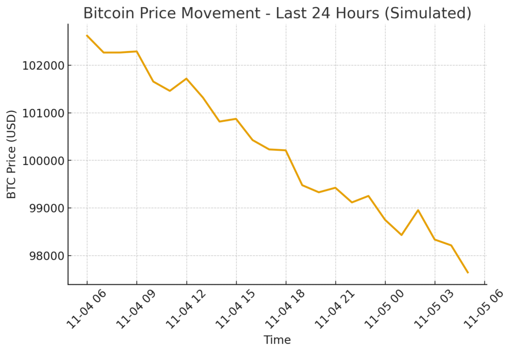 Price action: Bitcoin fell from about $102,500 to trade near $97,800 in the Asian session, representing a loss of roughly 4.5 percent in under six hours. On-chain data and derivatives platforms show more than $1.1 billion in long liquidations within the last 24 hours. The sudden unwind pushed volatility higher across the crypto complex, with Ether and major altcoins following lower.